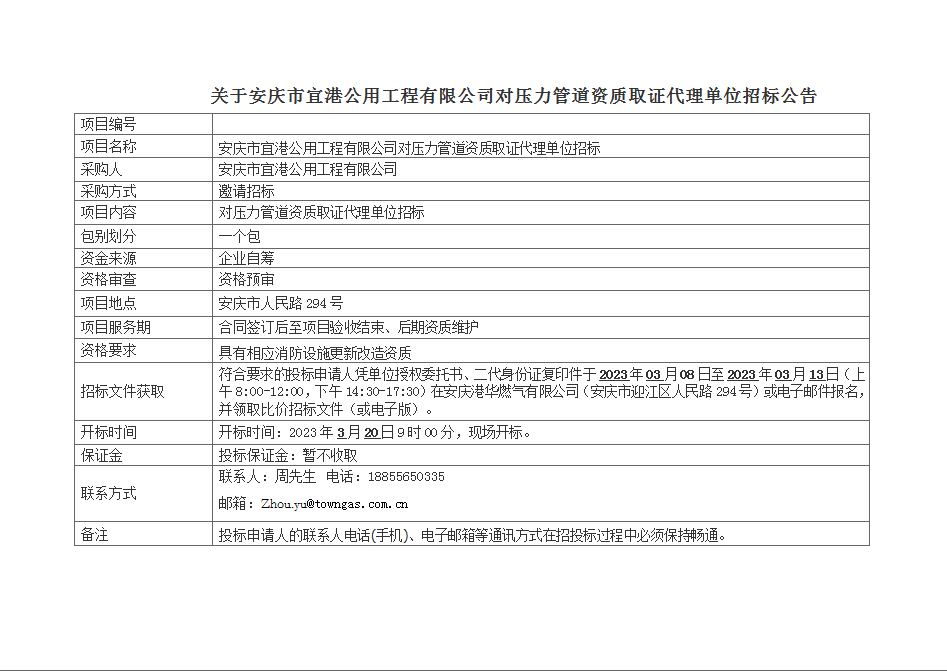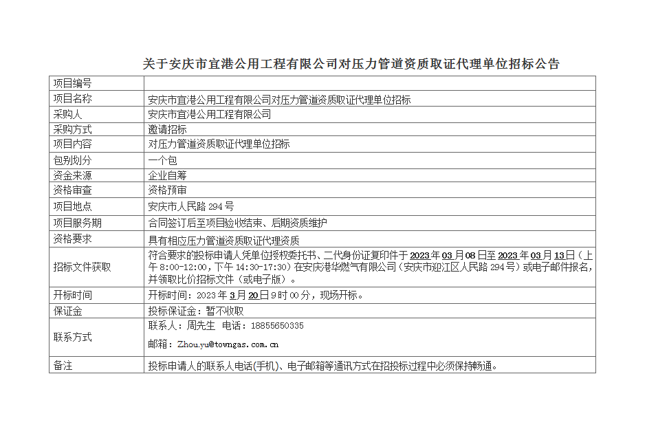 關于安慶市宜港公用工程有限公司對壓力管道資質取證代理單位招標公告