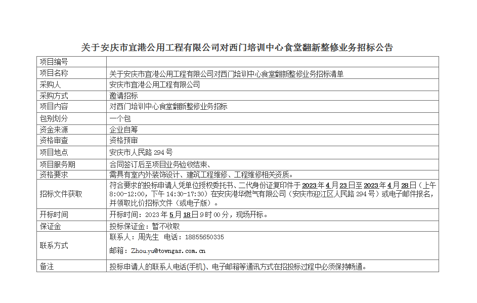關于安慶市宜港公用工程有限公司對西門培訓中心食堂翻新整修業(yè)務招標公告