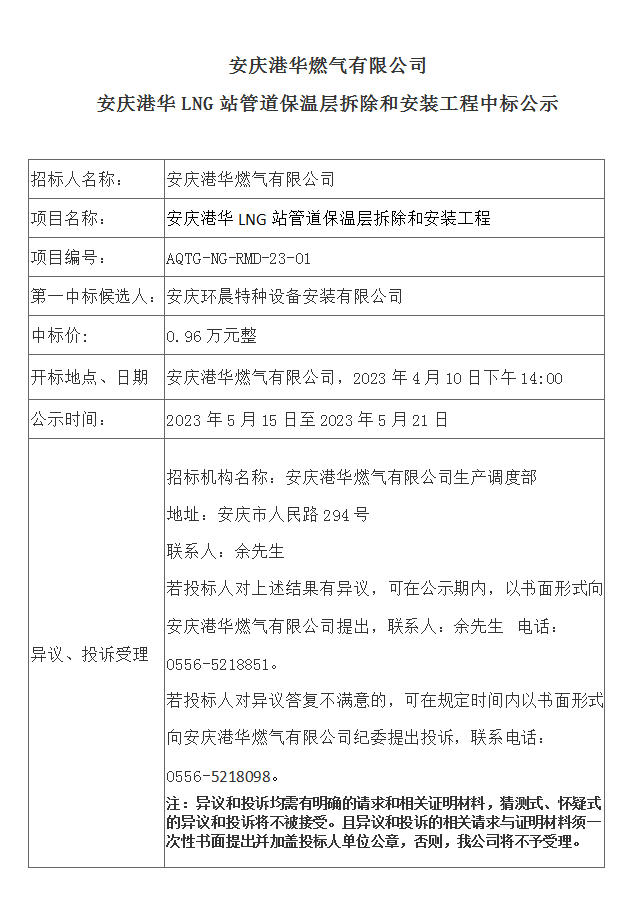 安慶港華燃氣有限公司安慶港華LNG站管道保溫層拆除和安裝工程中標公示