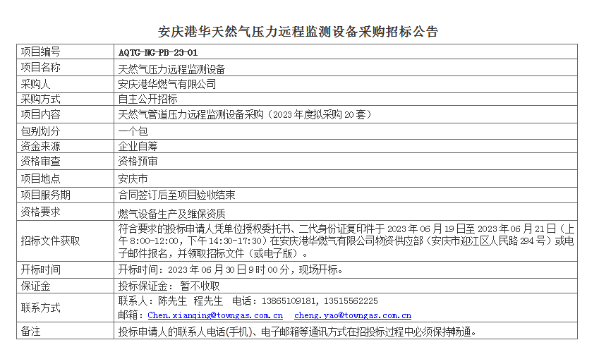 安慶港華天然氣壓力遠程監測設備采購招標公告