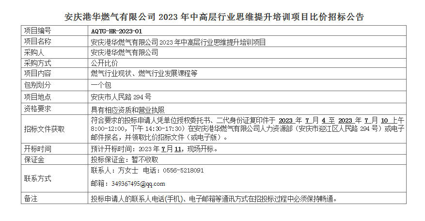 安慶港華燃氣有限公司2023年中高層行業思維提升培訓項目比價招標公告