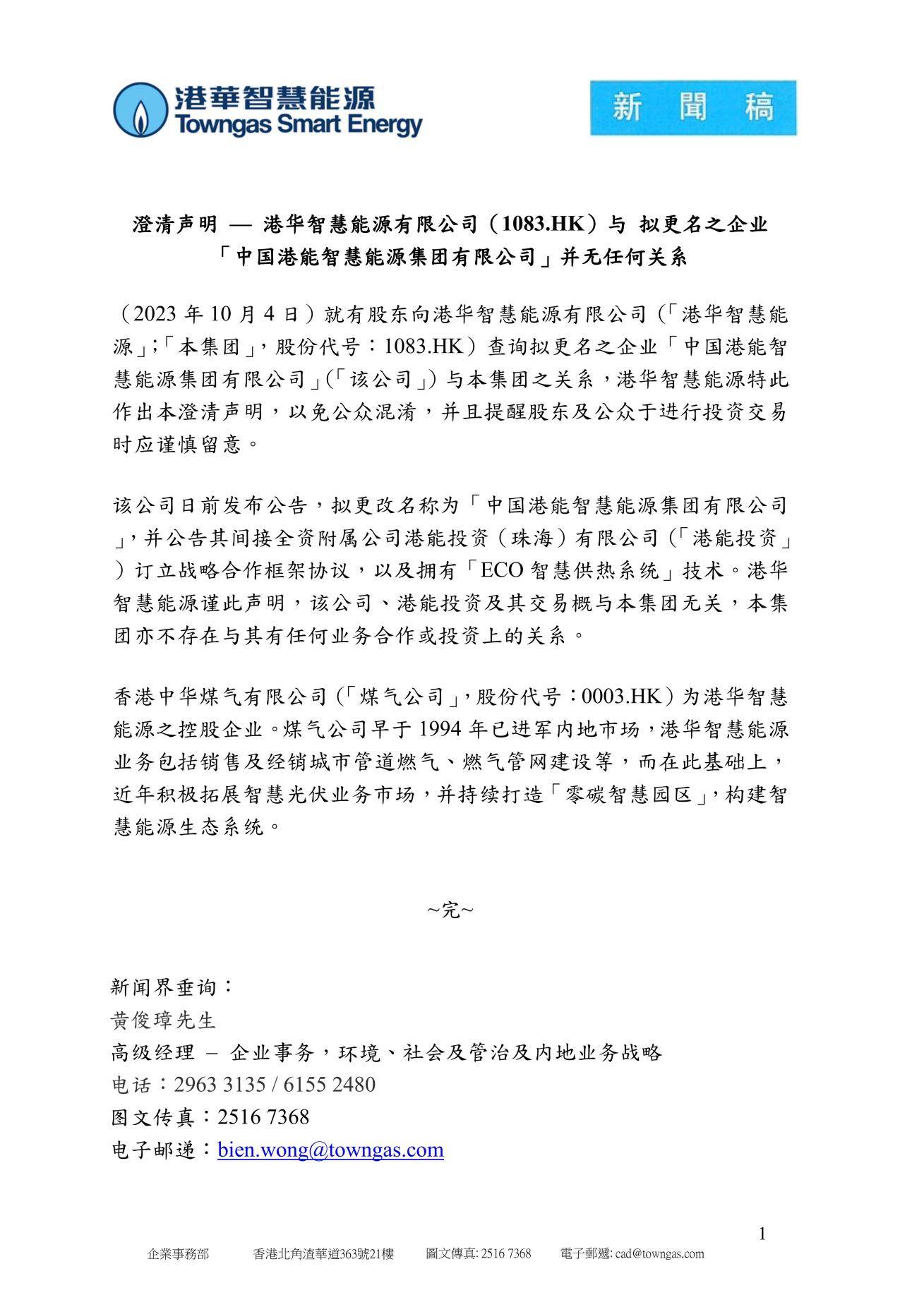 澄清聲明 — 港華智慧能源有限公司(1083.HK)與 擬更名之企業 「中國港能智慧能源集團有限公司」并無任何關系