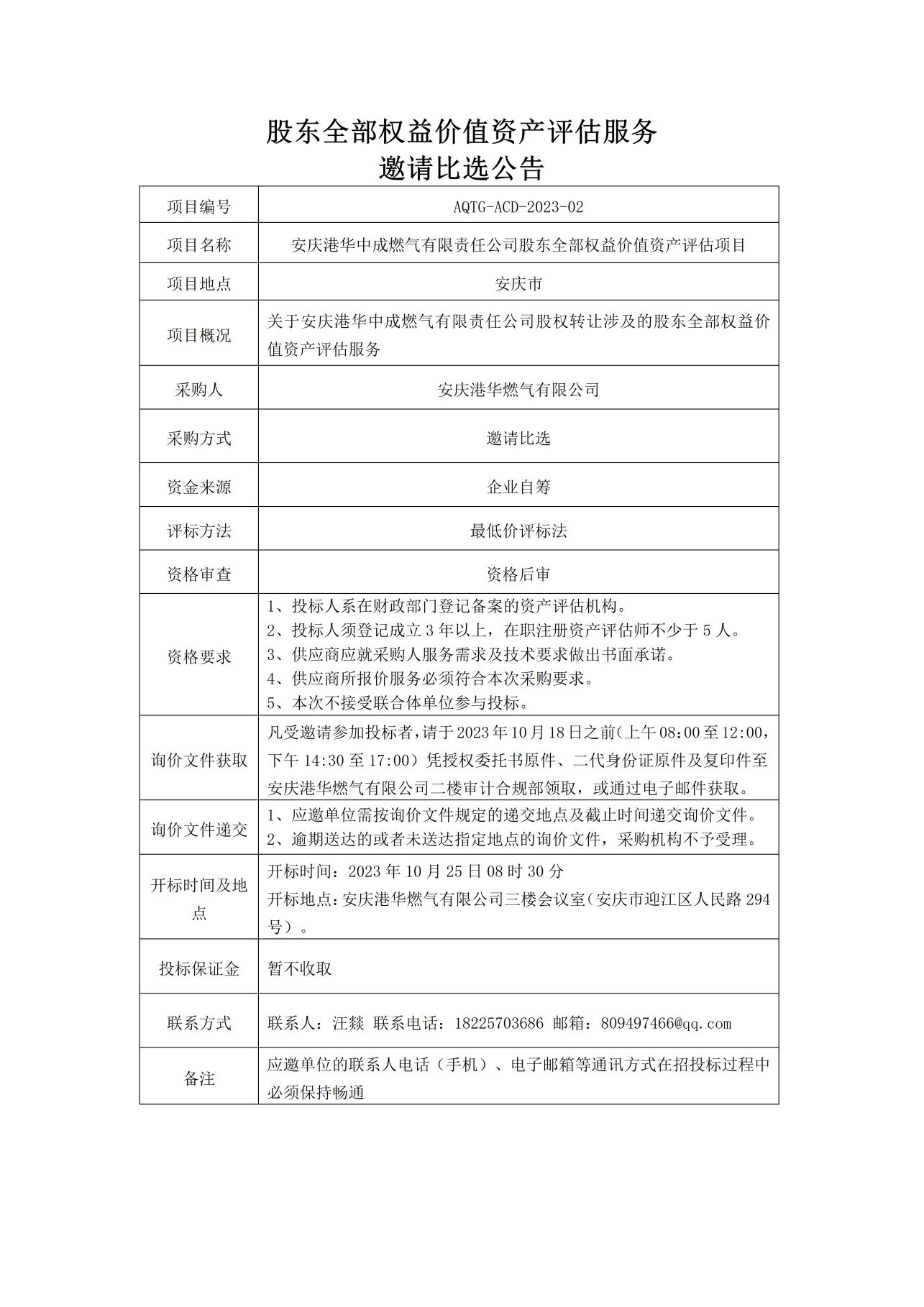 安慶港華中成燃氣有限公司股東全部權益資產評估服務邀請比選公告