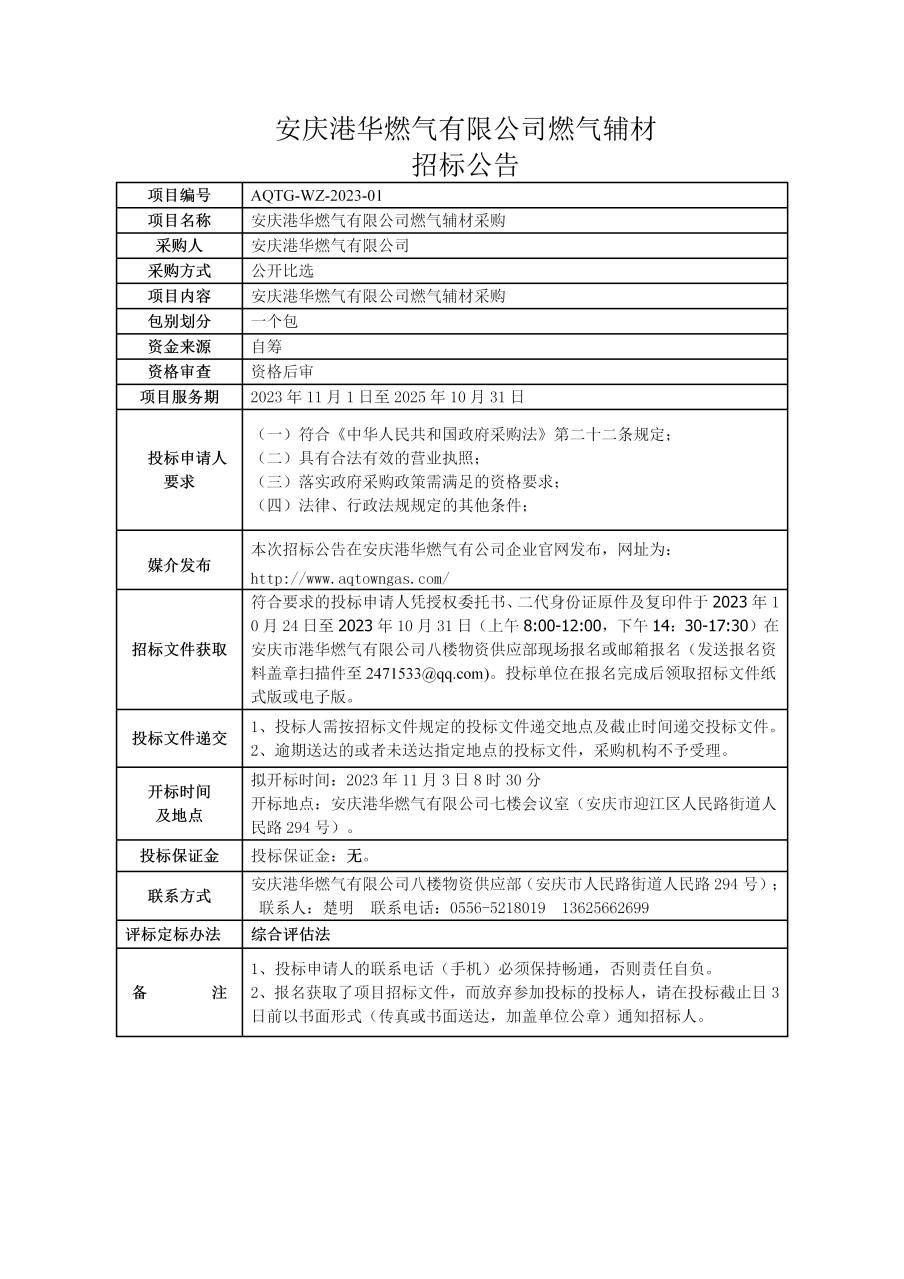 安慶港華燃?xì)庥邢薰救細(xì)廨o材招標(biāo)公告