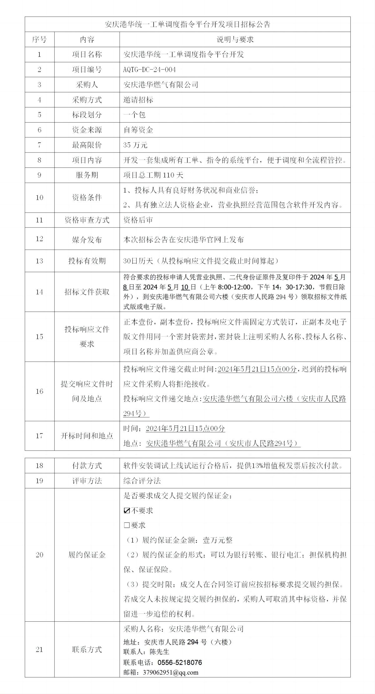 安慶港華統一工單調度指令平臺開發項目招標公告