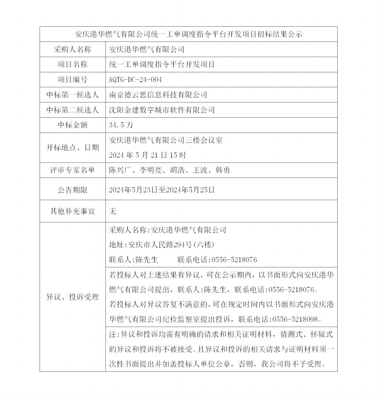 安慶港華燃氣有限公司統一工單調度指令平臺開發項目招標結果公示