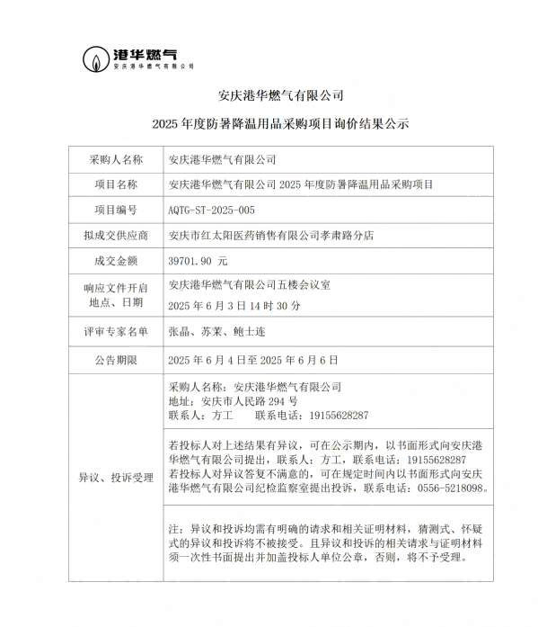 安慶港華燃?xì)庥邢薰?025年度防暑降溫用品采購項(xiàng)目詢價(jià)結(jié)果公示