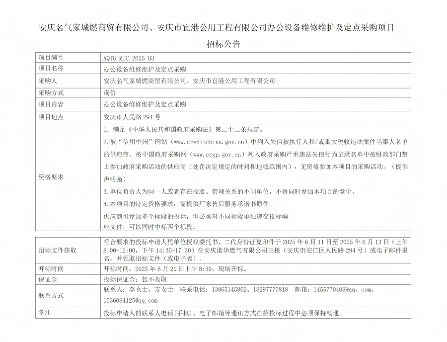 安慶名氣家城燃商貿有限公司、安慶市宜港公用工程有限公司辦公設備維修維護及定點采購招標公告