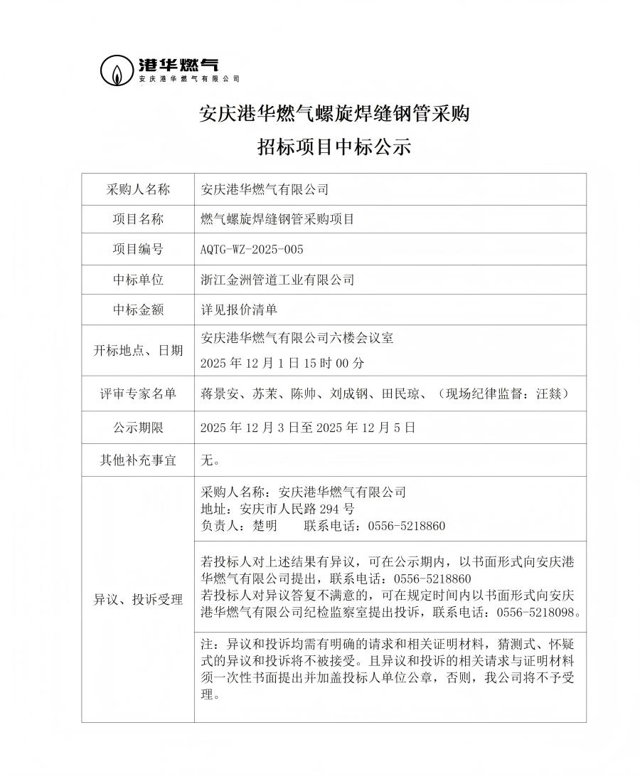 安慶港華燃?xì)饴菪缚p鋼管采購招標(biāo)項(xiàng)目中標(biāo)公示