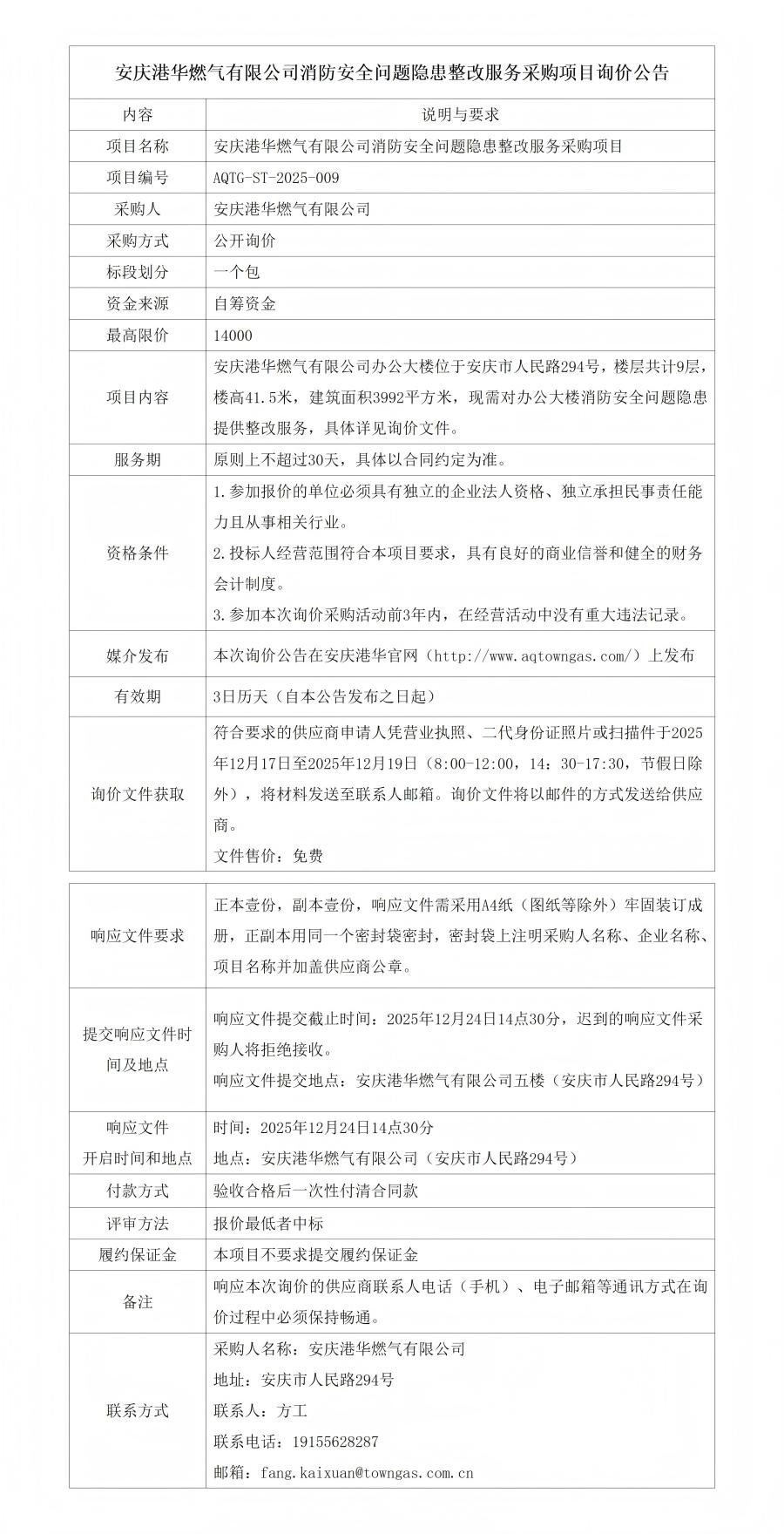 安慶港華燃氣有限公司消防安全問題隱患整改服務采購項目詢價公告