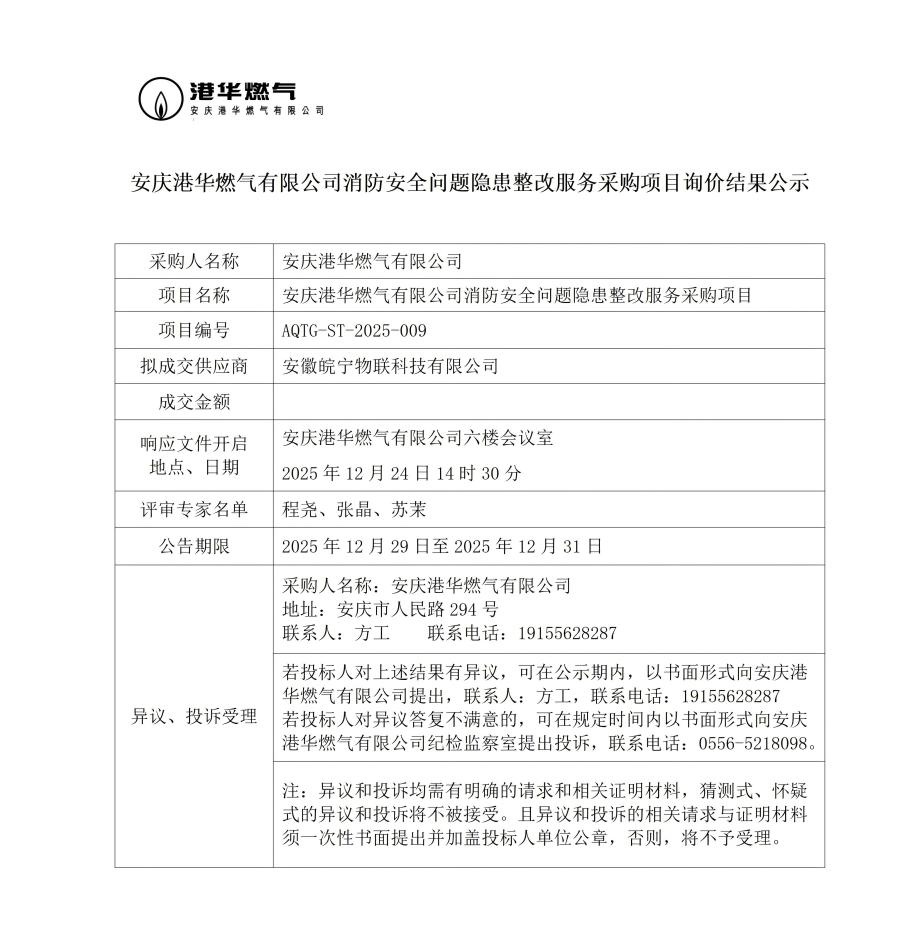 安慶港華燃?xì)庥邢薰鞠腊踩珕栴}隱患整改服務(wù)采購項(xiàng)目詢價(jià)結(jié)果公示