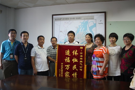 7月16日下午,市大觀區臘樹園社居委工作人員及部分社區居民代表將一份“體恤民情、造福萬家”錦旗送到安慶港華,感謝安慶港華在臘樹園燃氣工程建設中付出的努力。