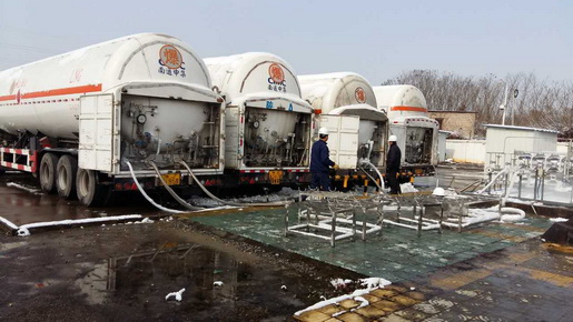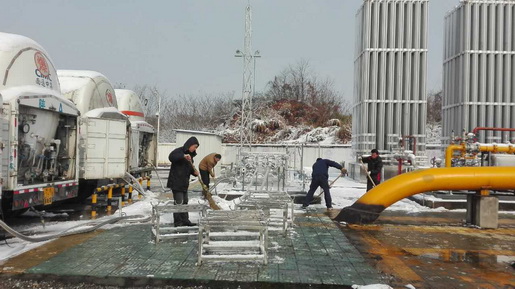 圖為1月23日,LNG釋放站工作人員在進行儲罐倒罐作業、清掃積雪